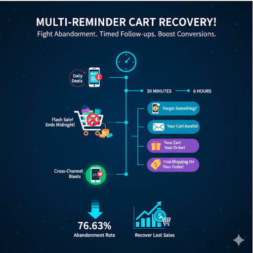 | Multi-Reminder Cart Recovery | Cart abandoners | 30 min,2 hr, 6hr, 24hr reminders with incentives | +45% cart recovery rate |