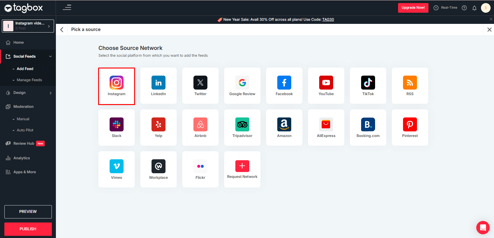 Step. 3 – In the popup that appears, choose the Instagram as your feed source and fill the required details, and once you are finished, you will get all the related posts in your feed.