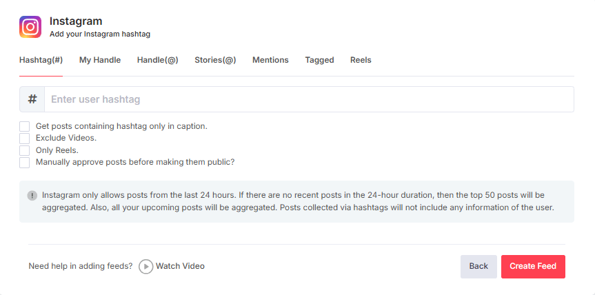 - Choose from the Stories and Reels feed types to gather Instagram videos.