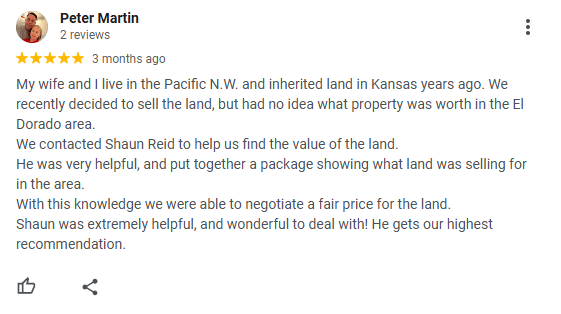 The client praises the real estate agent for his help valuing and selling inherited land in Kansas. Living in the Pacific Northwest, the client had yet to learn what the property was worth in the El Dorado area. The agent provided valuable information about the land process and helped them get a fair price.