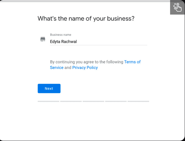 Step 2: Add your business name. Use the exact name of your business as it appears on your business card, website, and other materials.