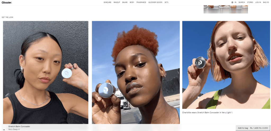 Glossier is curating a feed of shoppable videos to leverage it properly and embedding it into the website homepage. The Instagram shoppable feed showcases the brand’s products in use by customers and improves the journey from product discovery to purchase.