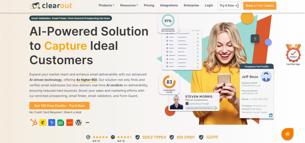 Clearout is an AI-based SaaS platform and is a trusted leader for its high accuracy in the market. It helps businesses maintain a clean database with 99% accuracy and ensures GDPR compliance. It verifies emails in real time, cleans large lists, and finds accurate B2B contacts so your sales and marketing teams can focus on accurate leads. Like the best modern SaaS tools, Clearout fits quietly into your workflow, protecting forms, syncing with your CRM, and giving you clean and verified contacts.