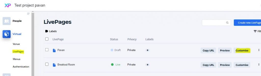 Once you are in your project, Click on Virtual –> Live Pages. Select the page where you want to integrate the widget and click on Customize.