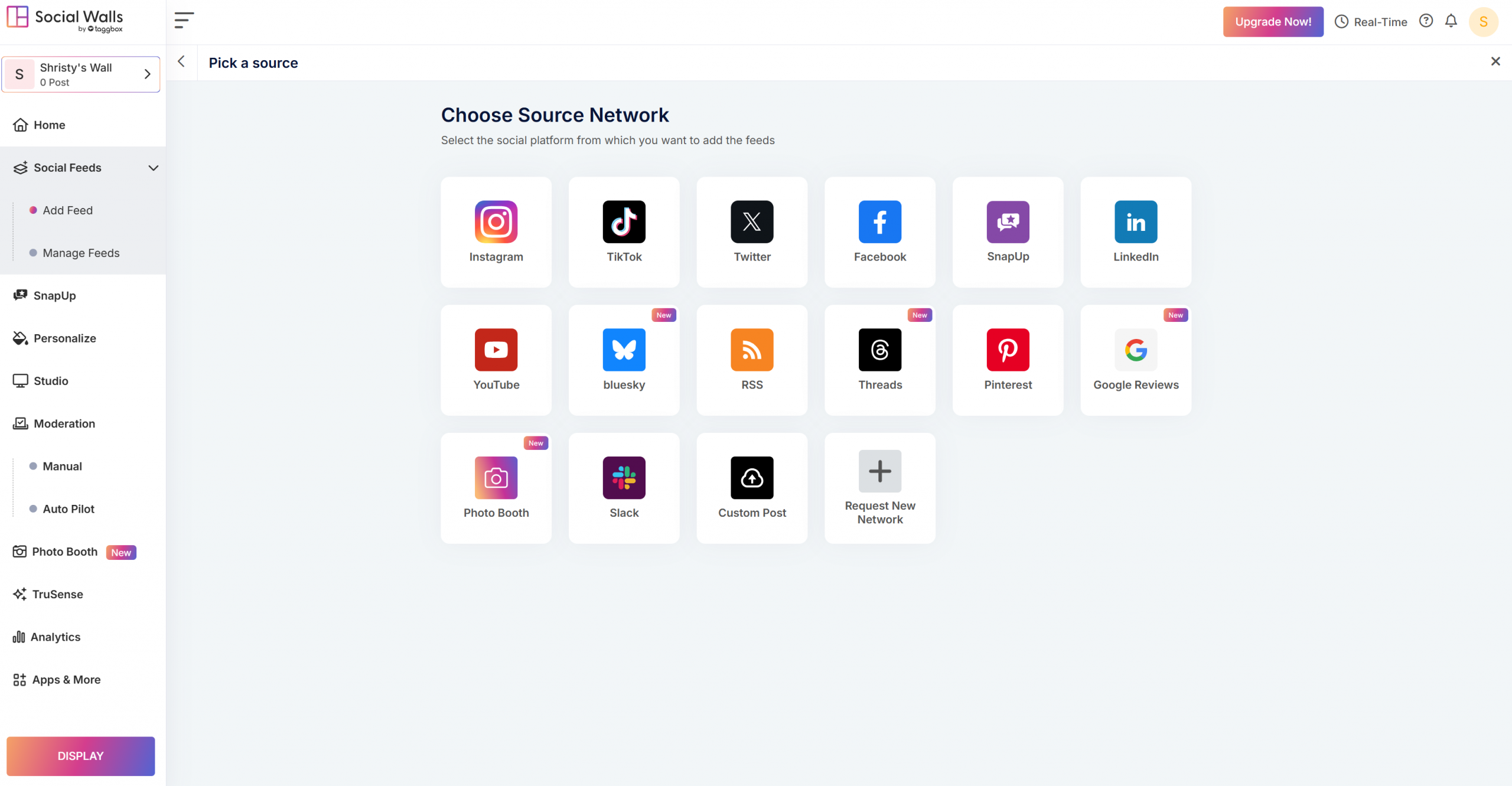 Now create a Social Feed by choosing the source among the 10+ social media platforms provided by Taggbox’s Social Walls.