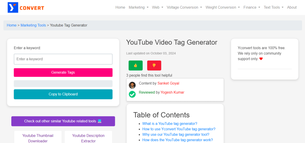 Yconvert offers powerful marketing tools for YouTube video optimization. They provide a range of tools such as a tag generator, title generator, thumbnail generator, and more. Using these tools is incredibly easy, completely free, and requires no signup. The tags generated are highly relevant, and the number of suggested tags has significantly increased, helping to improve your video’s visibility.