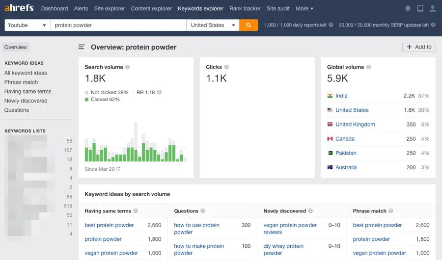 Ahrefs YouTube Keyword tool helps you to optimize your videos for better visibility and engagement on YouTube. It provides insights into the monthly search volume for each keyword, displaying how many times the keyword is searched on YouTube. This data helps you understand the potential reach of your videos based on the selected keywords.