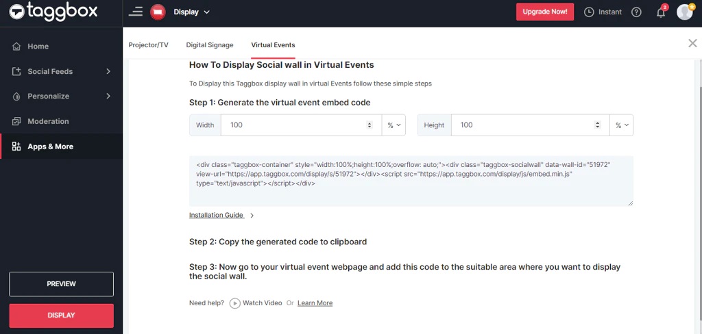 Befolgen Sie die angegebenen Anweisungen, um Ihren Einbettungscode zum Veröffentlichen einer Social Wall in Ihrem virtuellen Event zu erhalten.