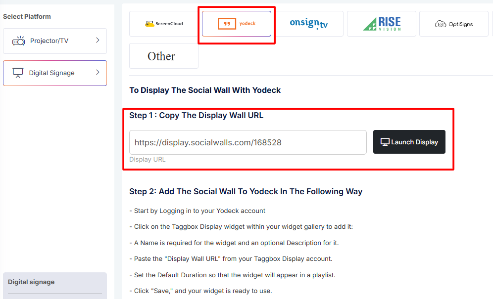 - Vai su "Display digitale", seleziona "Segnaletica digitale" e scegli "Yodeck" dalle opzioni, quindi copia l'URL del display.