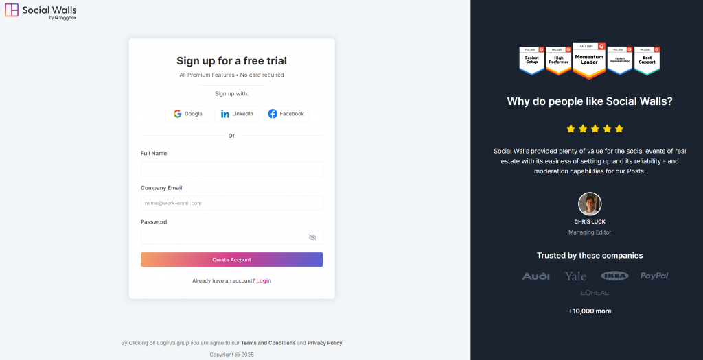 - Accedi al tuo Account Social WallsSe sei un nuovo utente, puoi creare un account gratuito.