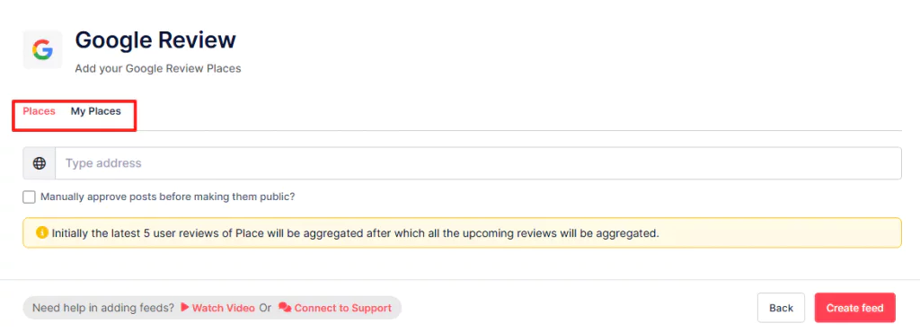 5. コンテンツを追加するには、以下から選択します。 「場所」 or 「私の場所」 住所を入力します。情報を入力したら、「フィードを作成"ボタンをクリックします。
